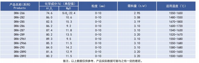 DRA-Z該系列產(chǎn)品主要由氧化鋁和氧化鎂組成,屬富鋁尖晶石型,適用于各種碳鋼、錳鋼、耐磨鋼、高速工具鋼、不銹鋼及各種合金鋼的熔煉。適用溫度范圍為1480℃~1820℃。依據(jù)不同的適用溫度,列出如下產(chǎn)品: