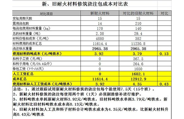 小澆包使用我司可塑包襯料,第一次試用結(jié)果900包,核算成本后就為客戶節(jié)省0.43/噸,后期